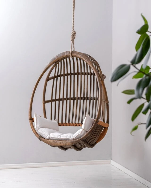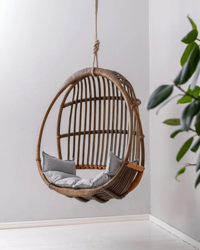 Itse riippukeinun materiaali on tietysti rottinki. Kyseessä on trooppinen puulaji, joten Sirkka viihtyy parhaiten tiloissa, joissa ilmankosteus on korkeahko. Jos kotona on kovin kuiva ilma, voi kosteutta lisätä ilmankostuttimella tai suihkimalla hieman vettä ilmaan rottinkikalusteen lähellä – pidäthän kuitenkin huolen, ettei rottinki tai nahka pääse kastumaan. Koneellinen ilmanvaihto tai lähellä sijaitseva lämpöpatteri saattavat kuivattaa ja sitä myötä haurastuttaa rottinkia.